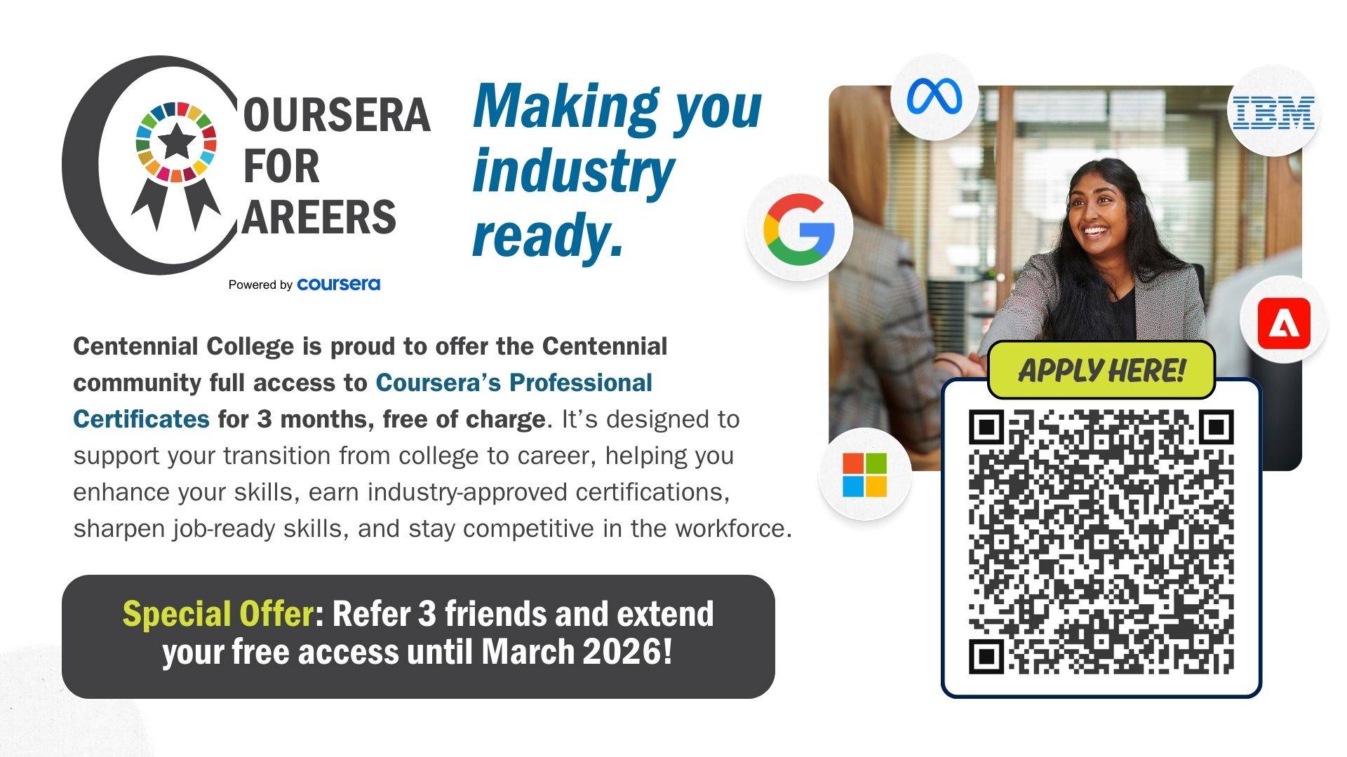 Through Coursera for Careers, Centennial College students, faculty, staff, alumni and COIE participants can receive a free Coursera license (normally a $60-80/month subscription!) for 3 months to develop in-demand skills and earn Professional Certificates from industry leaders such as Google, IBM, Meta, and Microsoft.